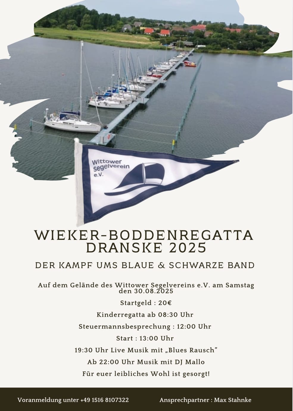 Am 30.08.2025 findet unsereWieker Boddenregatta 2025 in Dranske stattWer noch einen Winterlagerplatz im Freilager ehem. FPG Dranskesucht, bitte bis 20.08.2025 melden.Mail an wittowersegelverein@gmx.de oder über Whatsup. Die außerordentliche Mitgliederversammlung vom 01.08.2025führte zu Neuwahlen des Vorstandes.Den neuen Vorstand findet ihr im ImpressumDas Protokoll kommt per Mail, oder kann auf Anfrage postalischzugesendet werden.Hier auch einmal die vorläufige StegbelegungKennzeichenhalter sind bei Moni für 15,-€ pro Halter zu ordern.Hier die aktuellen Bankverbindungen (IBAN;SWIFT)neu auch fürdie zweckgebundene Rücklage